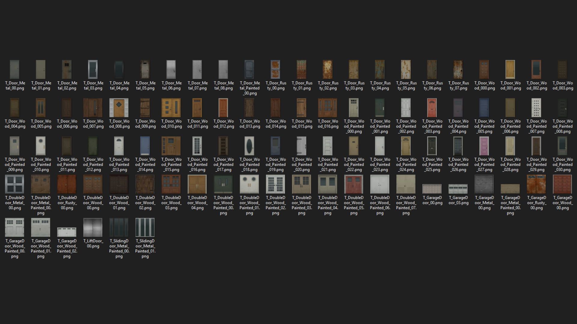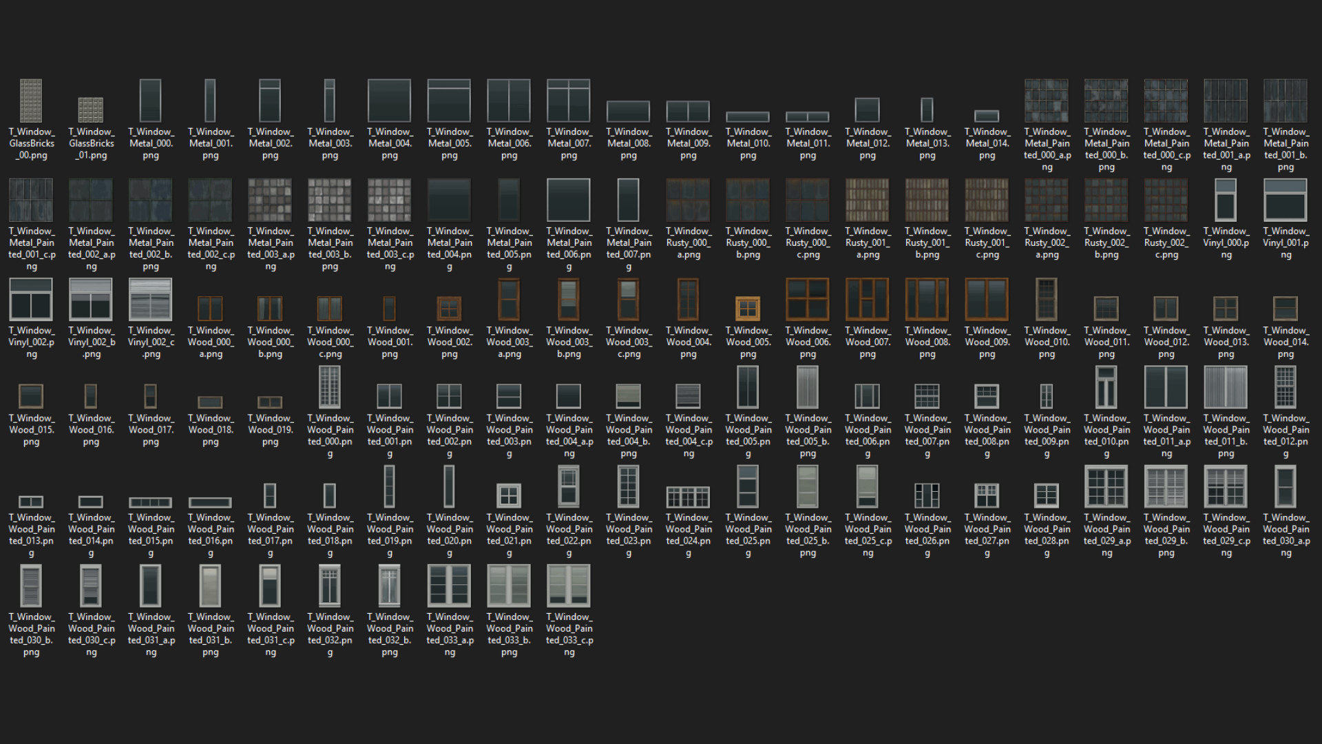 A collection of 240 low-res door and window textures made for the 5th console generation style projects. Lighting is already baked in, so there are no PBR maps. Textures use a reduced color palette to keep the retro look consistent. Sizes 16x32, 32x32, 32x64, 64x64, 128x64 (wide garage door).